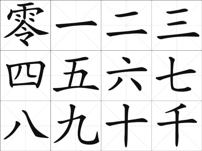 Below is a table of numbers in Regular Script (kǎi shū) from Zero (líng) through to Ten (shí) followed by a Thousand (qiān) for you to practice.
